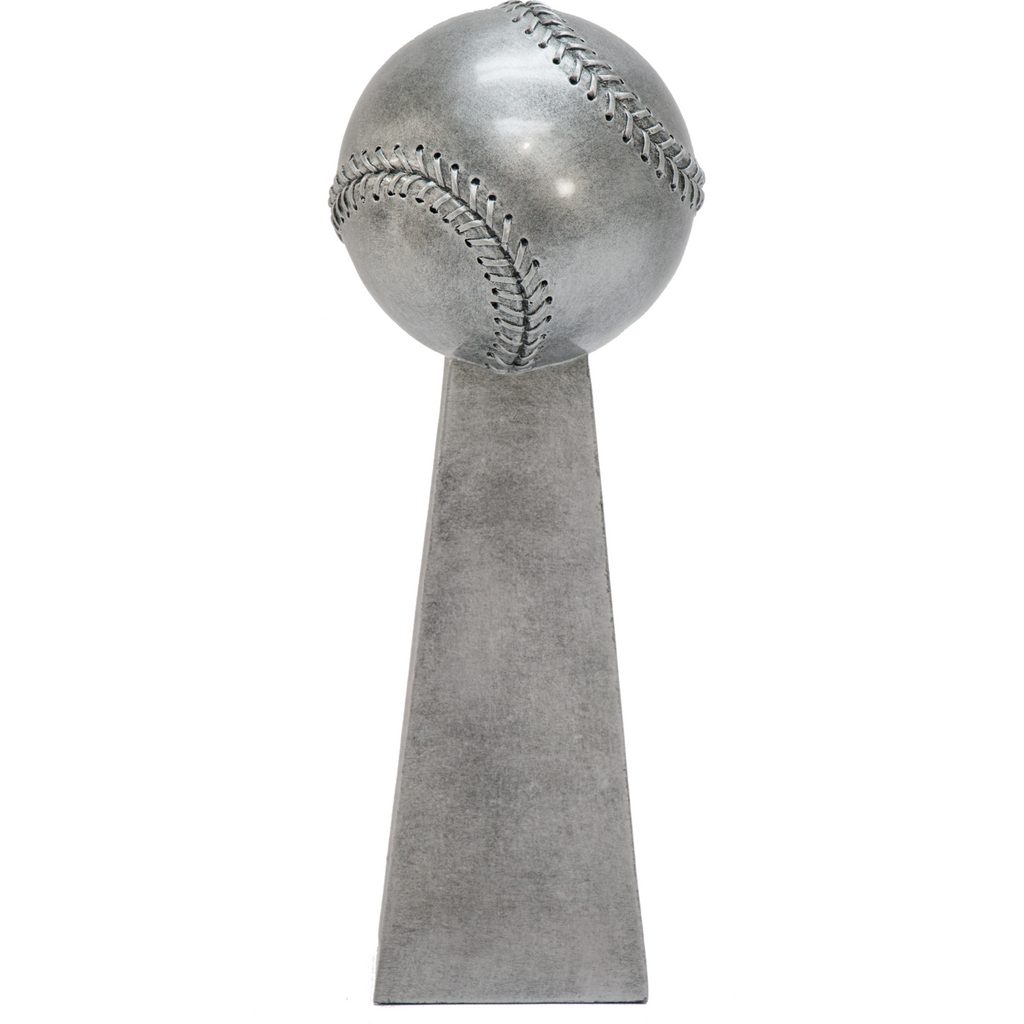 Introducing the Silver Baseball Sport Tower, a sleek and modern award with a shape similar to that of the Super Bowl trophy. This tower is perfect for sports league champions and comes with a plate that can be engraved. It is made of heavy ceramic resin and has a glossy silver finish.